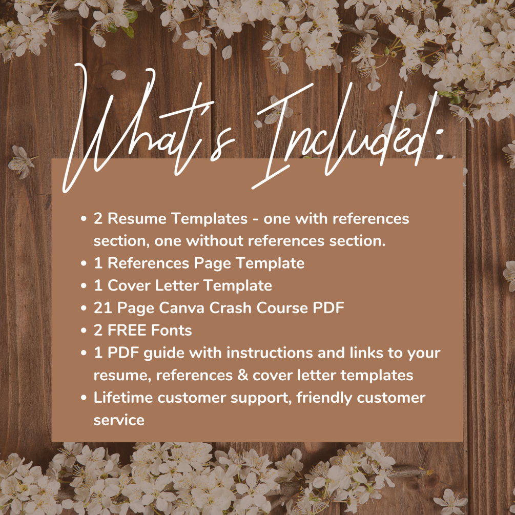 2 Different Resume Templates, 1 Cover Letter Template, 1 References Page Template, 2 Free Fonts, 1 PDF guide with instructions and links to your purchased product, Complementary Crash Course on How To Use Canva - 21 page PDF e-book, Lifetime customer support, friendly customer service!